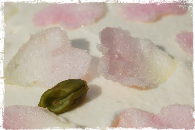 The recipe is straightforward and easy to prepare. I started by picking some rose petals, brushed them with lightly beaten egg whites and sprinkeld them with superfine sugar. Then I let them dry on a baking sheet that I previously covered with parchment paper. Within a few hours, the rose petals had dried.