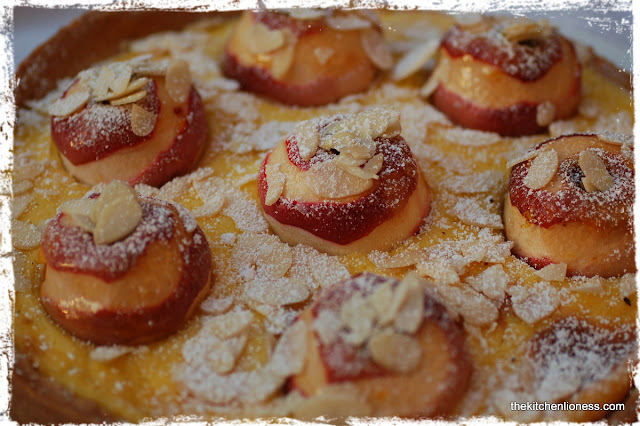 4. Taking one apple at a time, carefully place the apples on top of the custard, one in the center, the others around the "center apple". Push ever so slightly into the custard.