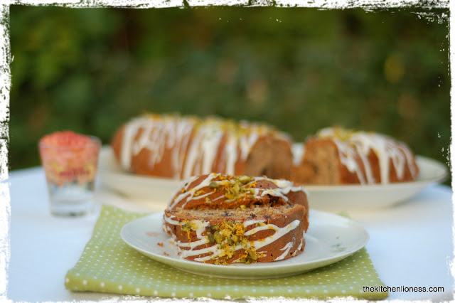 Since I had bought some fresh spices for this dish, I decided to bake an Oriental Spice Coffee Cake for dessert. The cake recipe calls for spices such as cardamom, ground cloves, cinnamon and saffron. But you also need to add freshly brewed strong coffee, light brown sugar, orange zest, pistachios and dark chocolate. I decided to use Lindt Excellence Orange Intense, which added even more wonderful orange flavor to this wonderfully moist cake.