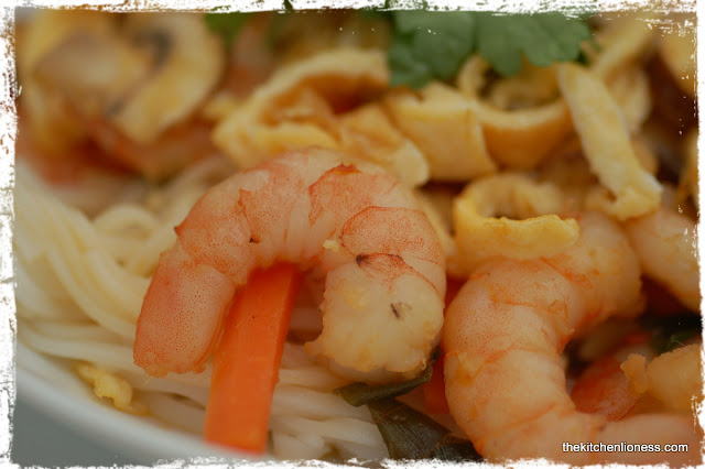 To serve, I divided the drained noodles between individual shallow bowls and ladled over the aromatic stir-fry with the prawns and served the final dish straightaway. I believe, chicken or scallops would a great alternative to the prawns. Overall, I changed this recipe quite substantially to suit our tastes but we loved the stir-fry with the delicious prawns…
