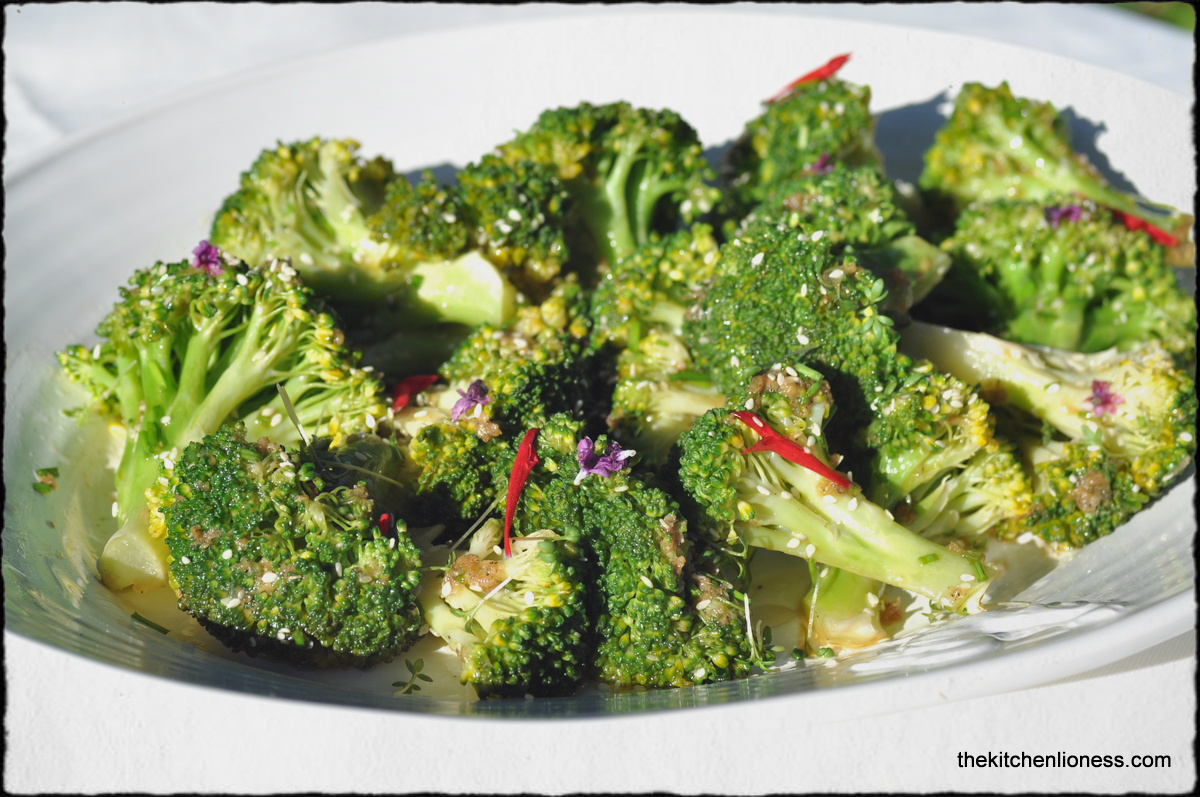 So, it was time to pull out that steamer basket again for the broccoli. The dressing which consists of garlic, freshly grated ginger, sugar, rice vinegar, soy sauce, toasted sesame oil, sesame seeds, spring onions, sea salt and pepper is actually almost identical to the Asian-inspired coleslaw on page 115 – a salad which I make on a regular basis to accompany Asian foods and which the kids adore. They could not get enough of this very tasty broccoli version – I made it twice this month and plan on making it many times still.