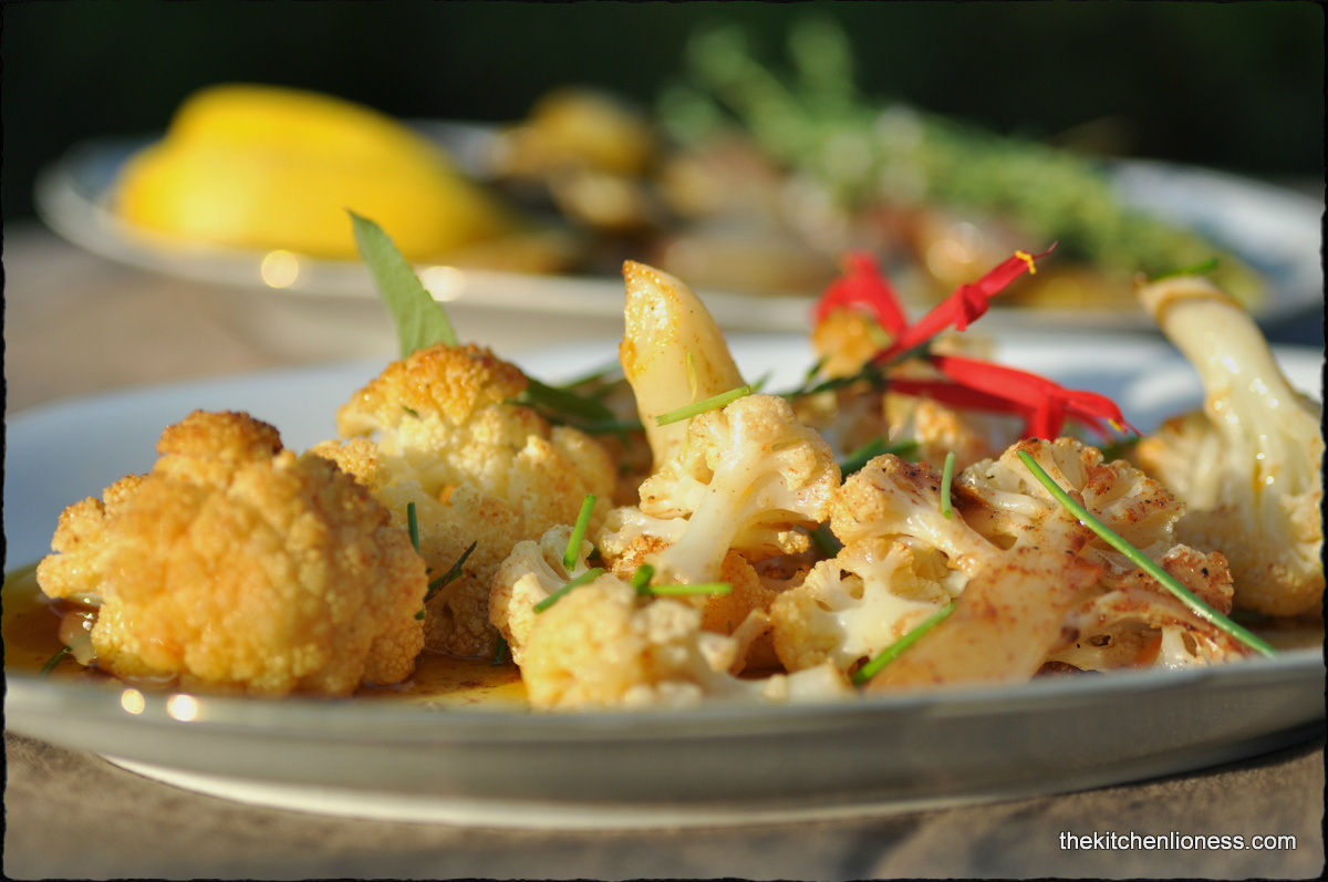 While I prepared the sprouts, I decided to make the „Roasted cauliflower with lemon and paprika“ at the same time. Almost the same procedure as the above Brussels sprouts – roast the cauliflower florets with lemon juice, pepper, salt, olive oil and a bit of hot smoked paprika.