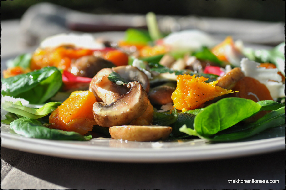 This is a delightful autumnal salad with lots of flavor and color. I chose one of my favorite squashes for this recipe, the „Butternut squash“ that I roasted with fresh sage from my herb garden. For the mushrooms, I chose some baby portabella mushrooms. My preferred kind of mushrooms.