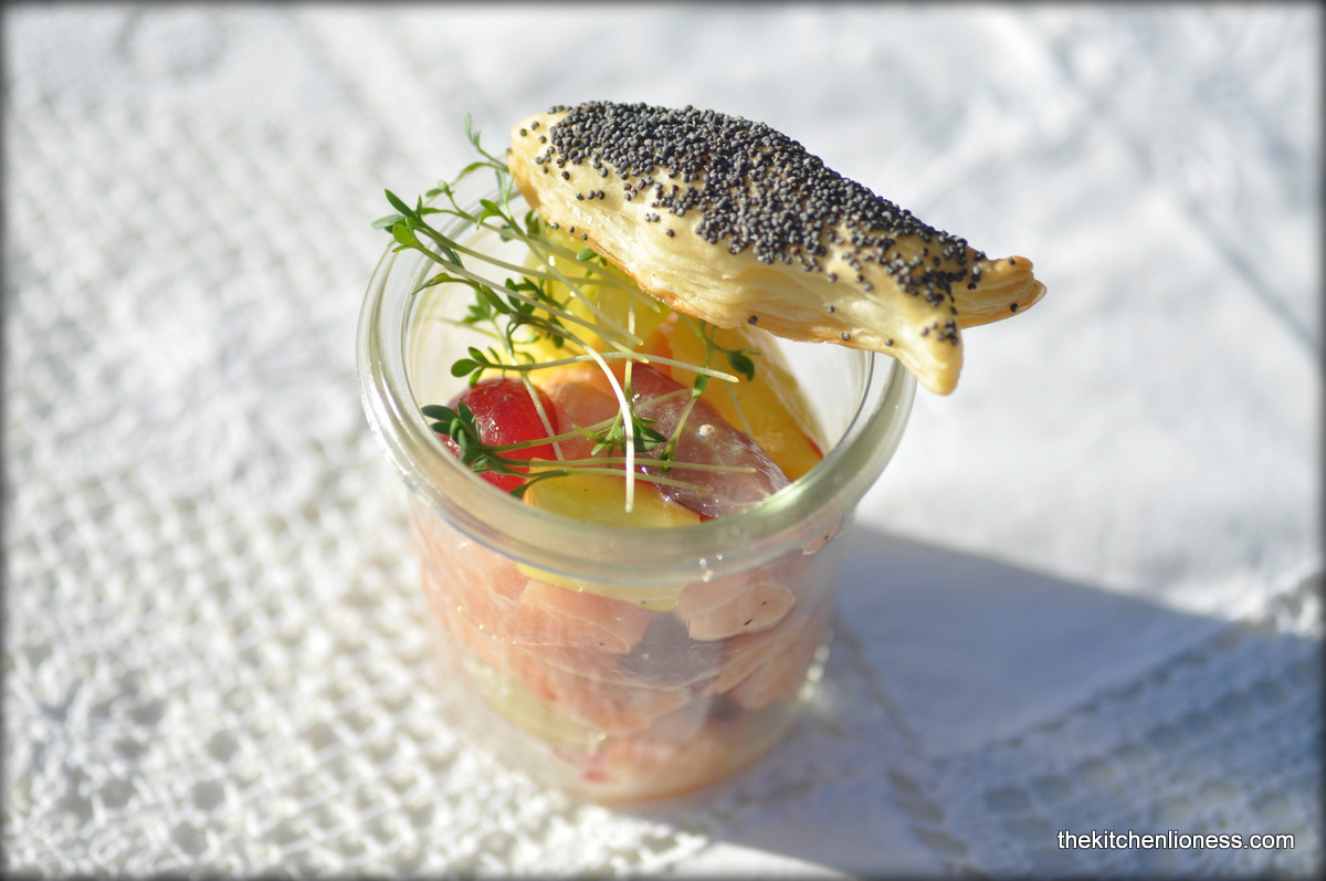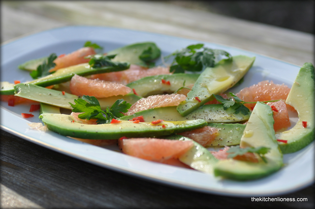 What a showstopper of a recipe with a genious mix of flavors and textures. Creamy, perfectly ripened avocado, tangy, citrussy grapefruit (which, to my great surprise, proved to be a bit hard to find around here and I had already lined-up blood oranges as a a back-up), spicy finely chopped chilli and some good quality extra-virgin olive oil, freshly ground black pepper and some lovely sea salt. What a delicious surprise.