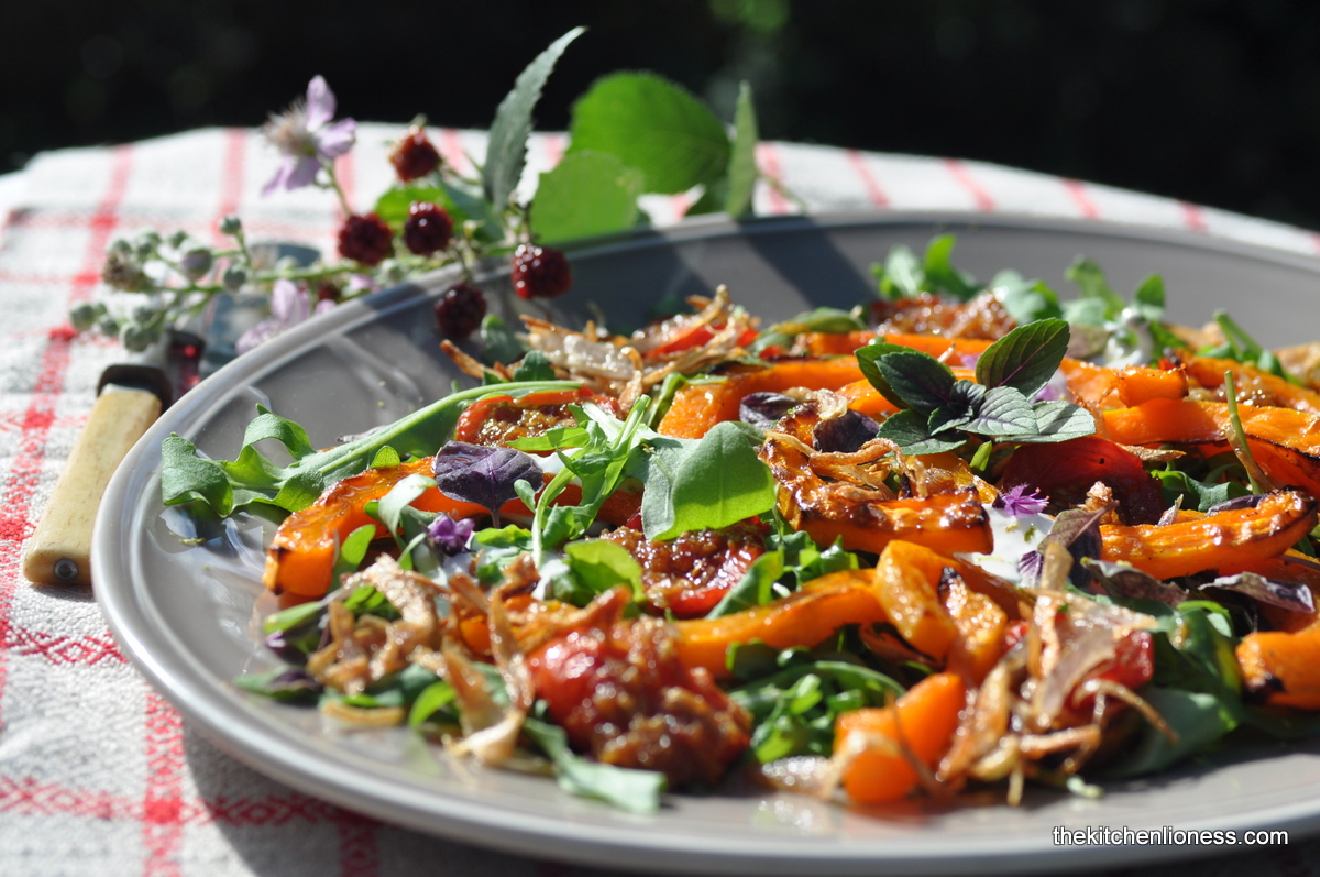 With roasted wedges of butternut squash, and plum tomatoes that get roasted for a two hours (!) with fresh ginger, red chilli, garlic cloves, and dark muscovado sugar and a cooling drizzle of Greek yogurt boldly flavored with ground cardamom, lime zest and juice as well as a finish of fried banana shallots, it is impossible to resist!