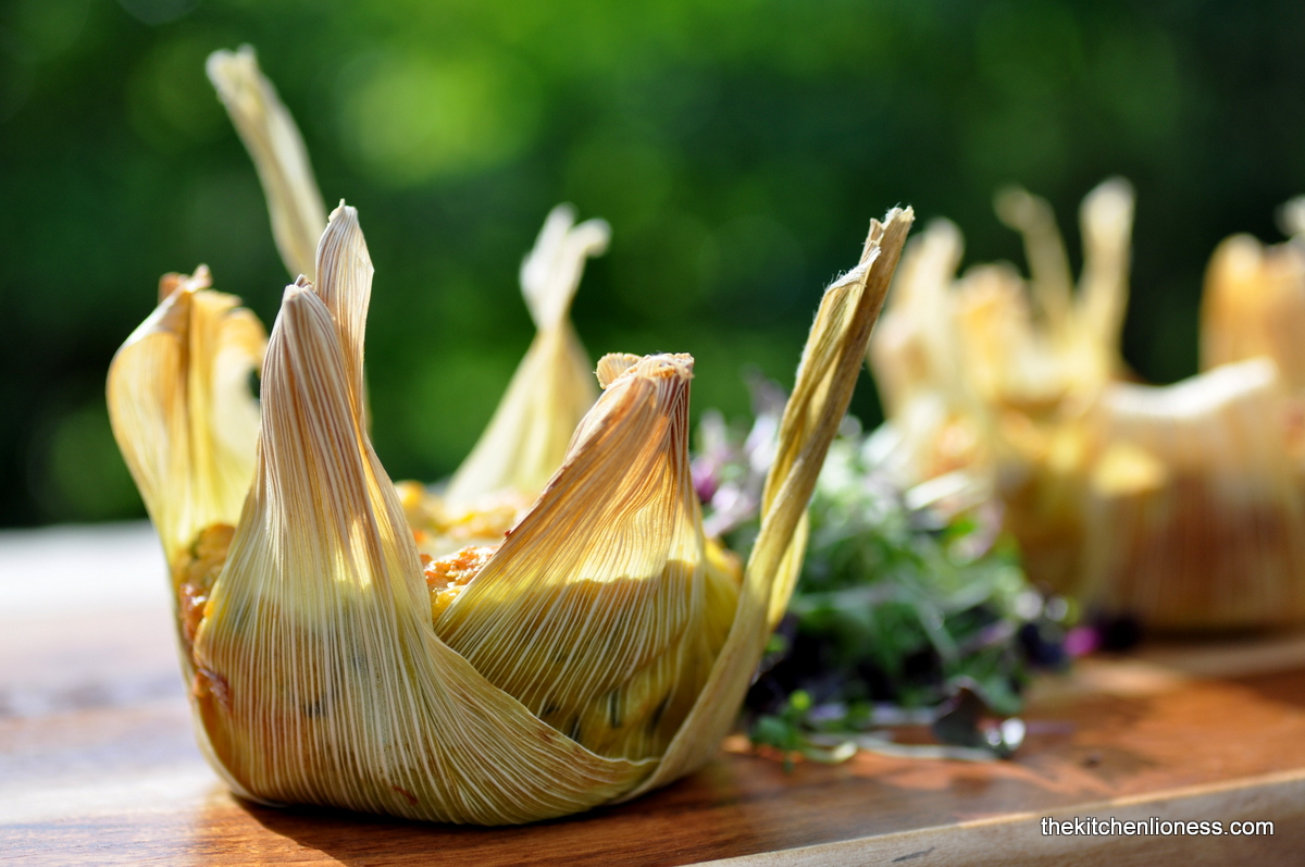 Then finally the wait was over and the long awaited cookbook arrived - onto my first recipe from the NOPI cookbook, the utterly delightful Corn Cakes with Feta - as suggested by Ottolenghi for that "restaurant look" I used the corn husks (rather than baking parchment) to line the muffin tins. They look lovely, like little bamboo baskets and are filled with lots of incredibly wonderful ingredients such as fresh corn, banana shallots, garlic, fennel seeds, ground cumin, celery seeds, tarragon leaves, good unsalted butter, farm fresh eggs, a bit of flour, Greek feta (you could also use a Dolcelatte here instead of the feta) sea salt and a rather good grinding of black pepper.