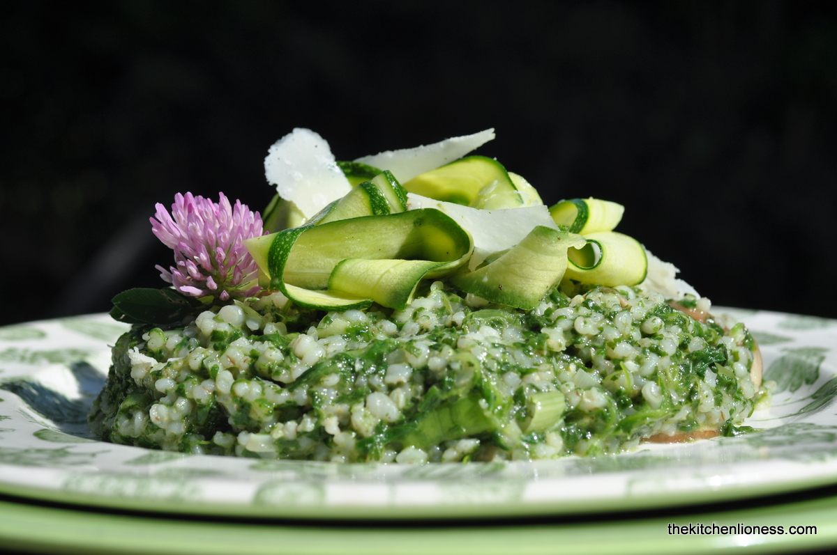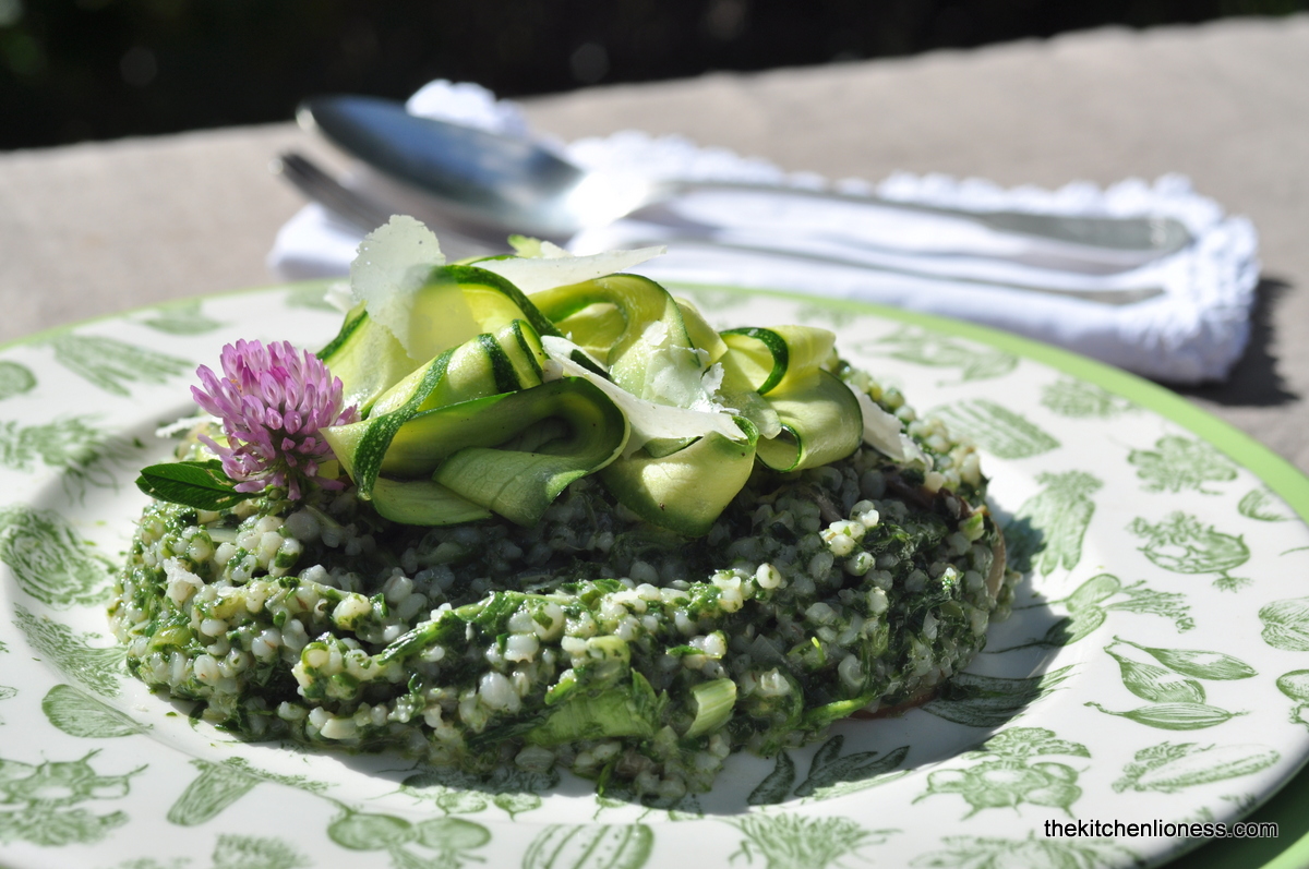 First cook the pearl barley, then make the green puree with watercress and fresh spinach. Fry some portobello mushrooms and some leeks and make a side salad of asparagus ribbons (or courgettes as the asparagus is not in season anymore) and shaved Pecorino Romano. Then serve a dollop of the incredibly green pearl barley risotto and top the dish off with the delightfully tangy salad that you should prepare just before serving so it keeps its crunch - which is a nice contrast to the creamy risotto.