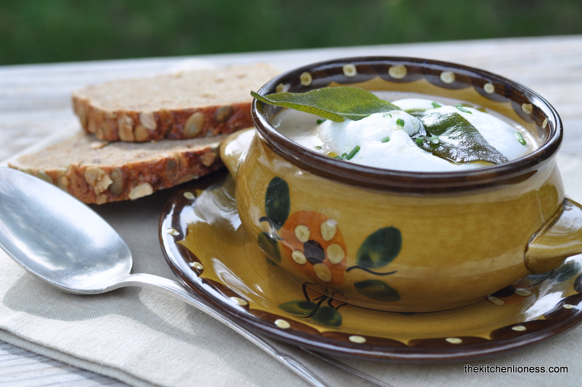 This is such an elegant and velvety soup, I cannot get over the taste – the finished soup got a nice garnish of sage leaves from my garden, fried in some light olive oil, a tiny trickle of oil, chives and foamed milk, cappucciono-style – serve this soup nice and hot and you will know what I mean – it is absolutely fabulous and perfect for serving to guests. Make sure to make some „Vegetable Stock“ (page 130) beforehand and serve some nice bread alongside.