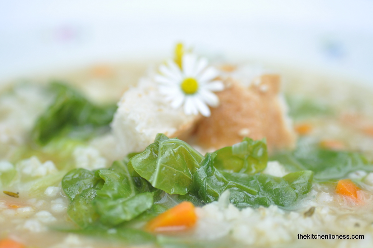Again, the base of this soup is Hugh´s Vegetable stock (page 130). This soup recipe is one of those recipes in this book that I keep coming back to on a regular basis. The finely diced vegetables in this pearl barley broth include onions, celery, carrots, and parsnip. The spices used are ground coriander, nutmeg, cayenne pepper and mace. Then as herbs some fresh thyme and a bay leaf from the garden and, of course, medium sized pearl barley. Around here, the stores carry pearl barley in three different grades, the medium one being my favorite to use in substantial soups like this one. There was lots of flavor from the spices, the veg and the soup base. Just remember that the pearly barley will absorb quite a bit of liquid and you will end up with a rather thick soup if you prepare it in advance.