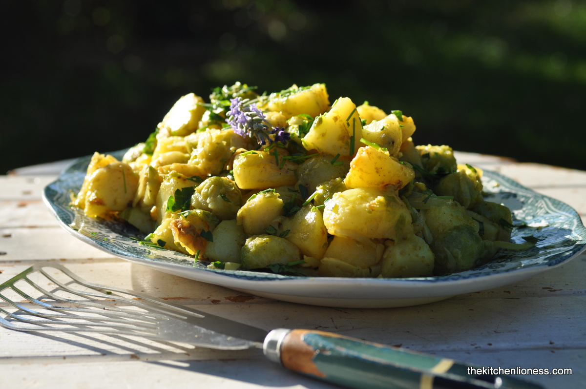 The name refers to the appetizing sound this stir-up of cooked potatoes and greens makes as it cooks. As kitchen recycling goes, this is probably the most useful of all, neatly dispensing with those most difficult of leftovers. I used cold cooked potatoes and Brussels sprouts as the main stars of this dish – then some finely sliced onions, salt, pepper and a mild curry powder. Kids loved this, it is not unlke the pan-fried potatoes (sans curry) that we make around here, except that you can add just about anything edible to it that strikes your fancy. Delicious. Easy. Fool-proof.