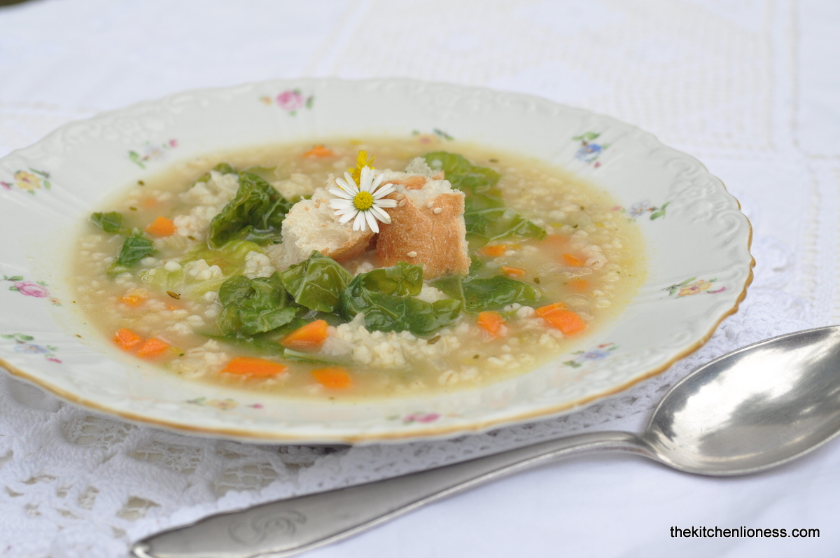 This time when I made this comfort-style soup, I decided to add the tender leaves of some lovely „butter cabbage“ or „Butterkohl“ as we call this around here – a regional specialty that I come across but once a year at the agricultural fair that we attend in September.