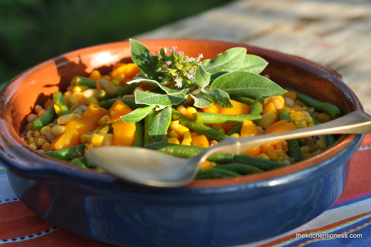 The third recipe that go my attention this month was the Porotos granados (page 146 ), from the chapter „Hefty Soups“. This traditional Chilean squash and bean stew is a rather hearty dish, perfect for this time of year. Other than an onion, garlic, Spanish sweet smoked paprika, fresh oregano, cannellini beans (in my case), homemade vegetable stock (page 130), a bay leaf from my garden, butternut squash, French beans, and corn, all you need is freshly ground black pepper, sea salt and a really good appetite.