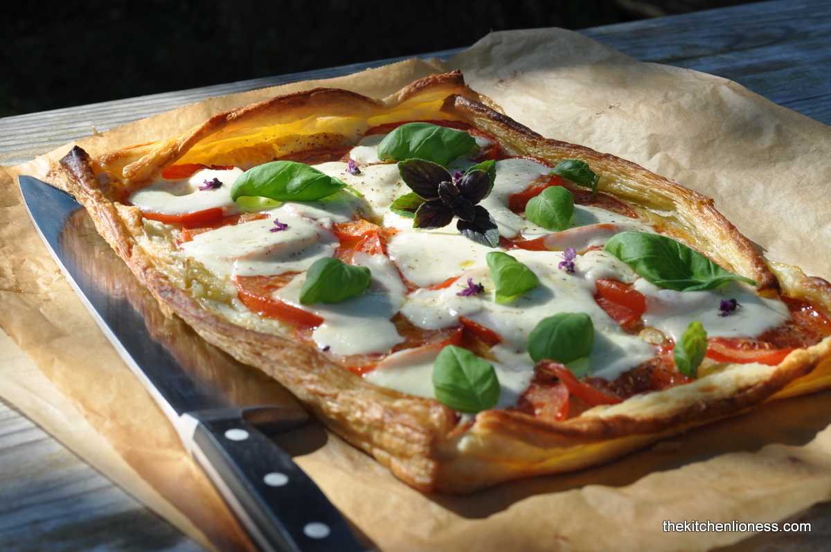 Recipe number six this month was the Basil and mozzarella tart (page 216) from the chapter "Store-Cupboard Suppers". If you really need another argument why you should always make sure to keep some fresh or frozen good-quality ready-made puff pastry at the ready, than this tart is it.