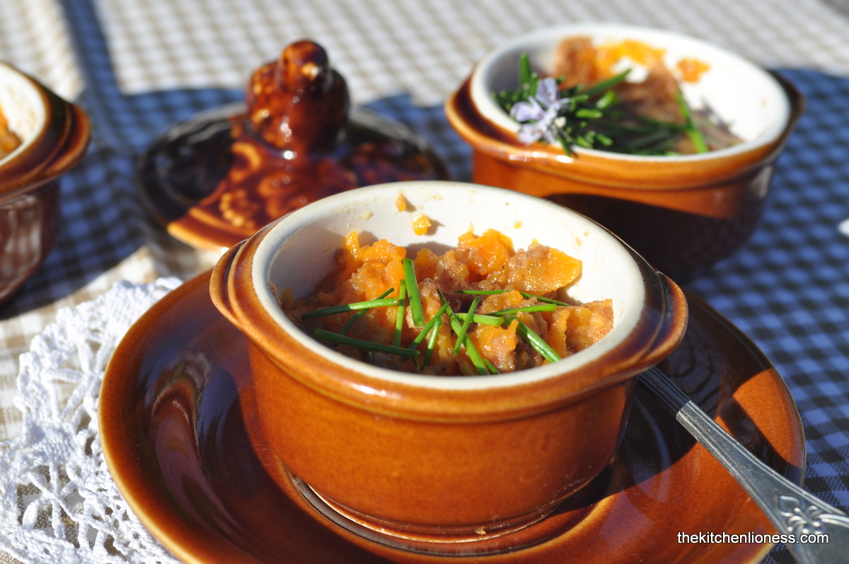 Not your every day type of side dish but the kids got their fill of sweet potatoes and I got to show off my lovely vintage gratin dishes that I found at a wonderful flea market the other day. The old lady that sold them to me for a song, just shrugged her shoulders and said that she did not have a clue what to do with them! And the moment I saw them I was thinking of this sweet potato gratin that I was planning on making as small individual gratins and serve them in exactly these dishes. Sometimes things just seem to fall into place...
