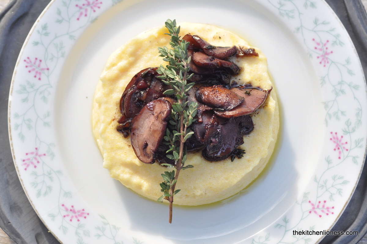 For the topping you will need mushrooms, garlic, more thyme, red wine, mushroom stock, pepper and salt to make the most flavorful mushroom ragout. Creamy and hearty, polenta makes a great alternative to mashed potatoes or pasta and served topped with this richly flavored ragout it is a vegetarian main dish – then all you need to enjoy this lovely meal is to pick up a pretty spoon, dig in and enjoy!