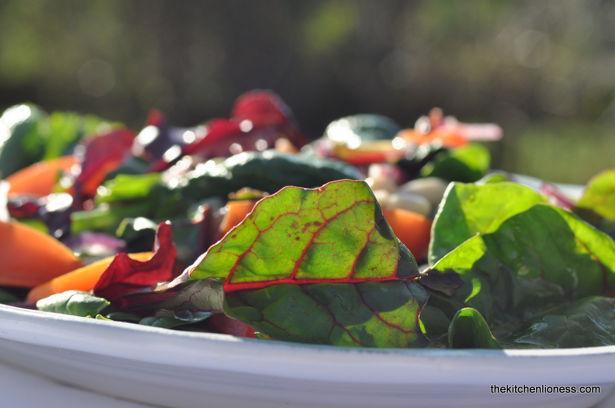 A fresh, wintry salad with white beans (soaked overnight or the canned variety), red onions, tomatoes and a dressing of olive oil, lemon juice, Dijon mustard, salt and pepper – to which I added a mixed salad of baby spinach and Swiss chard. The greens stood up well to those other hearty ingredients - they were really nice in combination with red onions, beans and tomatoes.