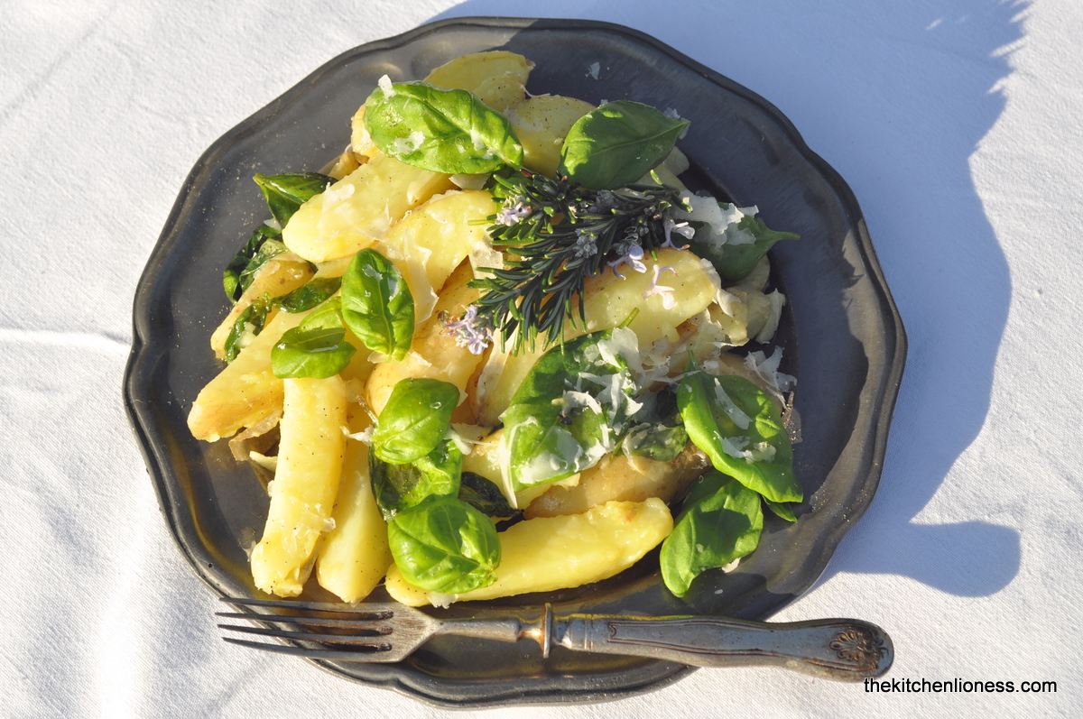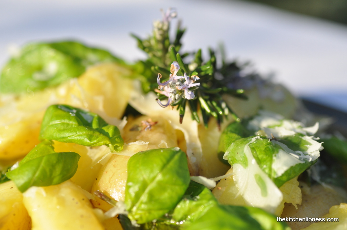A truly nice combination of cooked fingerling potatoes, loads of fresh basil, freshly squeezed lemon juice and plenty of shredded Parmesan. What on earth is not to like about this dish. There is the ease of preparation, the short list of ingredients, the extremly simple recipe and the immense „waftability factor“ that you get while preparing this. Not to mention the fabulous taste. We loved it. A keeper.