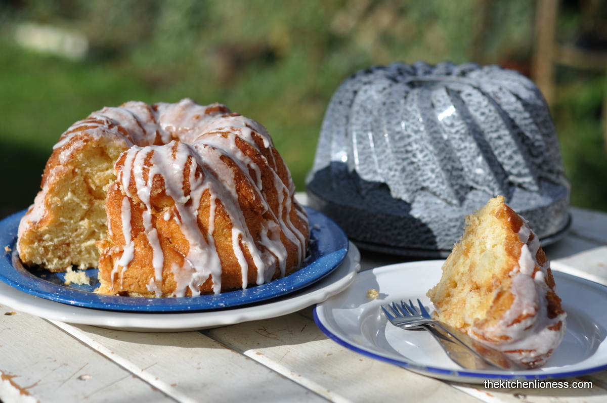 Sometimes inspiration for baking comes along in surprising ways. The other day I was sorting through some long forgotten cuddly toys and came across my hubby´s much hugged, stuffed, weary-looking stuffed toy monkey. Cleary, this toy monkey has been through thick and thin with his lovely owner. It did not take me long to decide that this particular little monkey desperately needed a special place in our living room. It is way too cute to be hidden away in a toy chest, and so it has finally found a new place, sitting high on one of our bookshelves, overlooking all that is going on around here. No longer hidden from the eyes of grown-ups and children anymore. I could not have asked for a better inspiration on a Monday morning, on the first day of school after the Easter break. Monkey Bread just seemed to be the perfect choice for dessert that day.