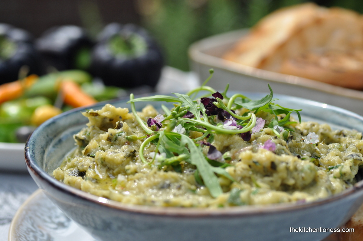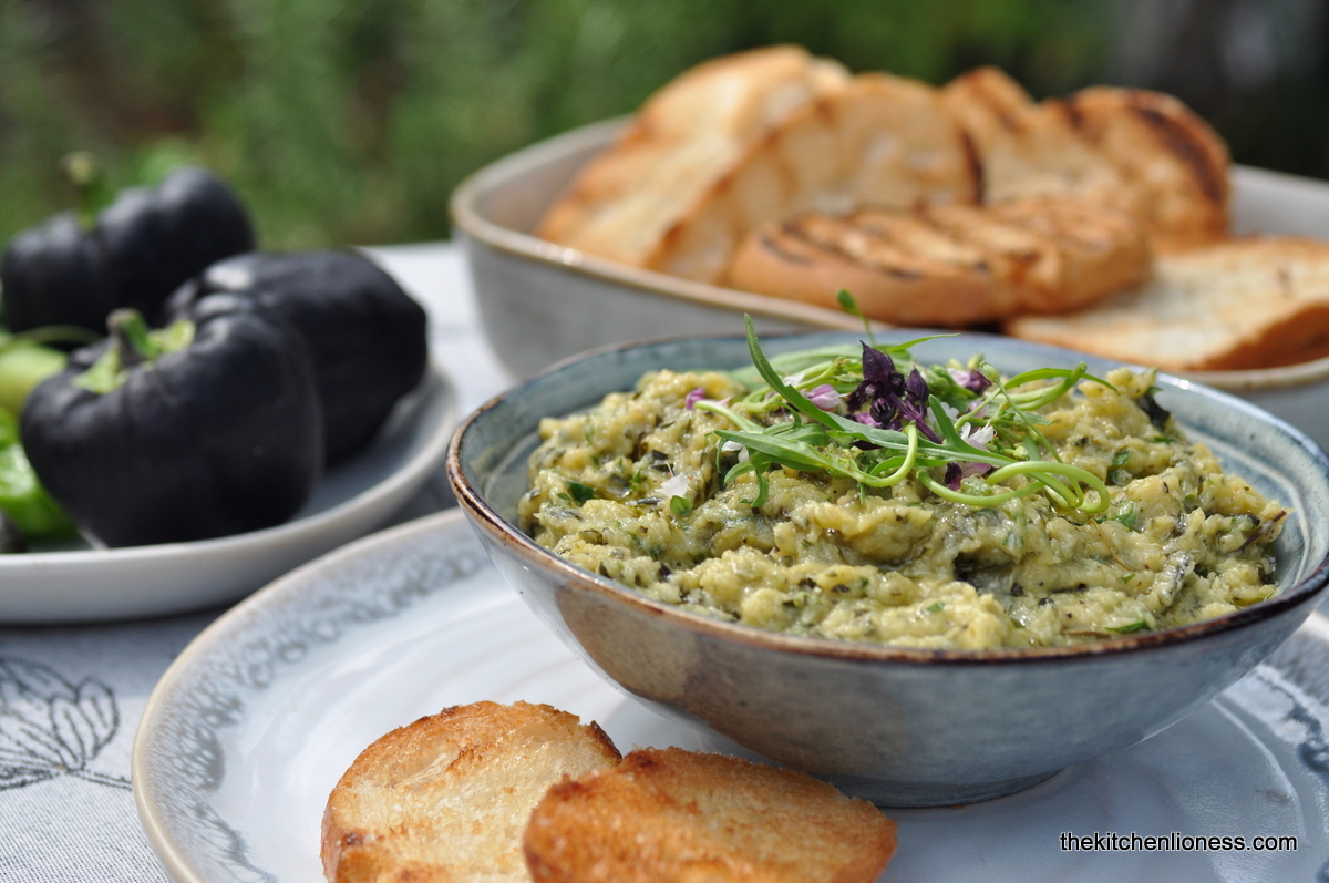 I had a few zucchini looking somewhat forlorn in the kitchen and some hungry kids waiting for dinner, so a dip was the obvious answer. This is a summery, roasted zucchini dip, which is both luxurious and easy to make, inspired somewhat by that famous dip called 'Baba Ganoush', the famous smoky roasted eggplant (aubergine) dip of Levantine origin, which happens to be one of my favorite dips to serve in summer and which I like to make with a bit of a chunky texture.