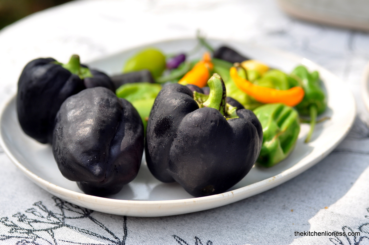 As I visited the farmers market in the beautiful city of Aachen (Aix-la-Chapelle/Germany) the other day, I came across some gorgeous organic produce, a selection of peppers, including black ones and an assortment of chilis - the farmer told me that they have specialized in growing a variety of chilis with different levels of heat - I happily bought a selection of both the paprikas and the chilis and served them alongside the dip and toasted slices of baguette.