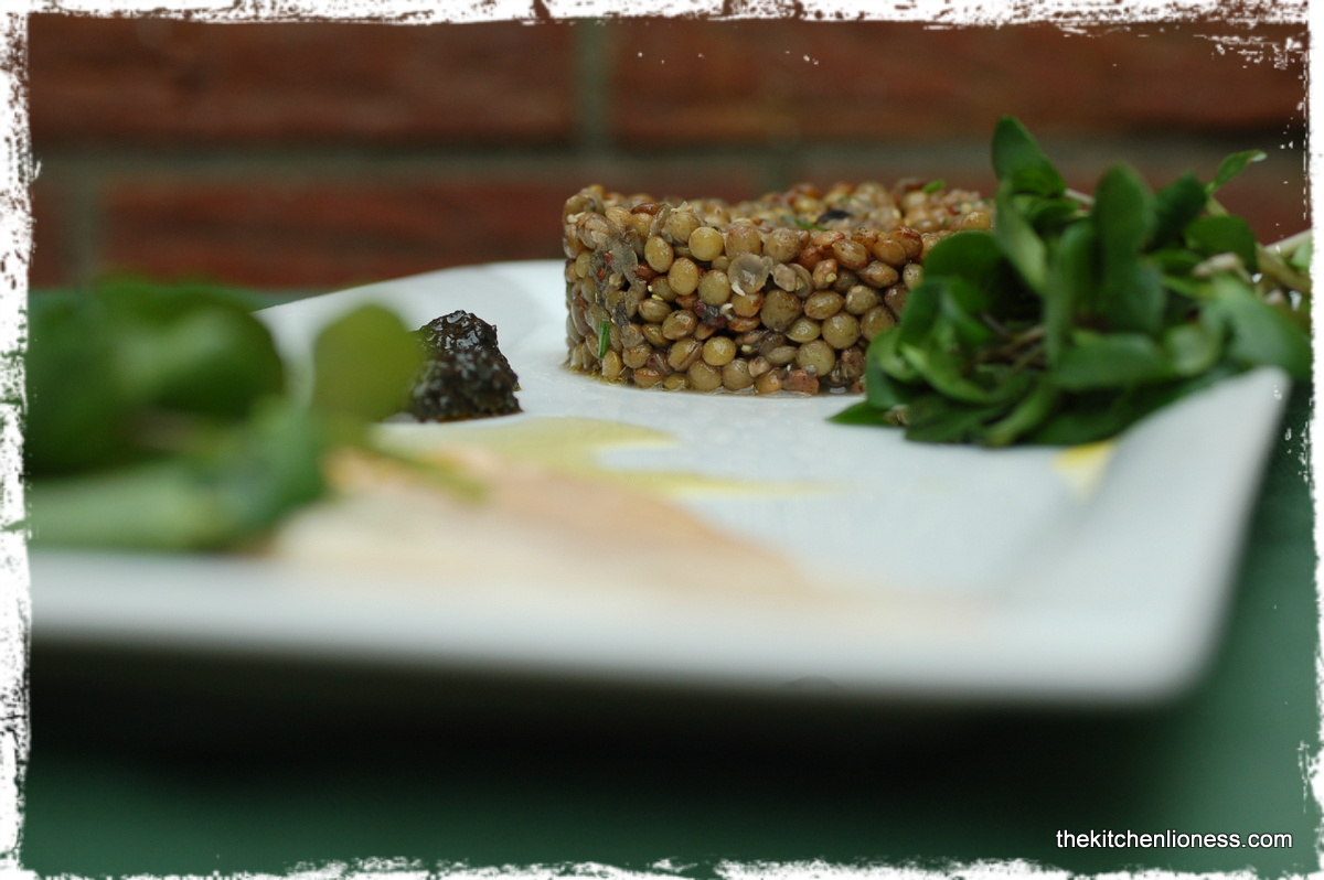 While the lentils were cooking, I prepared the “black olive tapenade” with olives, lemon zest, rosemary, thyme, piment d`esplette, parmesan and some good olive oil (just following Dorie´s recipe for tapenade). Then it was on to the salad dressing. I used some of the tapenade that I had just prepared, grainy French mustard, red wine vinegar, walnut oil and only a bit of olive oil, lemon juice (instead of the preserved lemon) and chives (instead of the scallions)., plus salt and pepper, of course. After carefully mixing the dressing with the lentils, I refrigerated the salad for a couple of hours before serving. This step gives the different flavors a chance to develop even further.